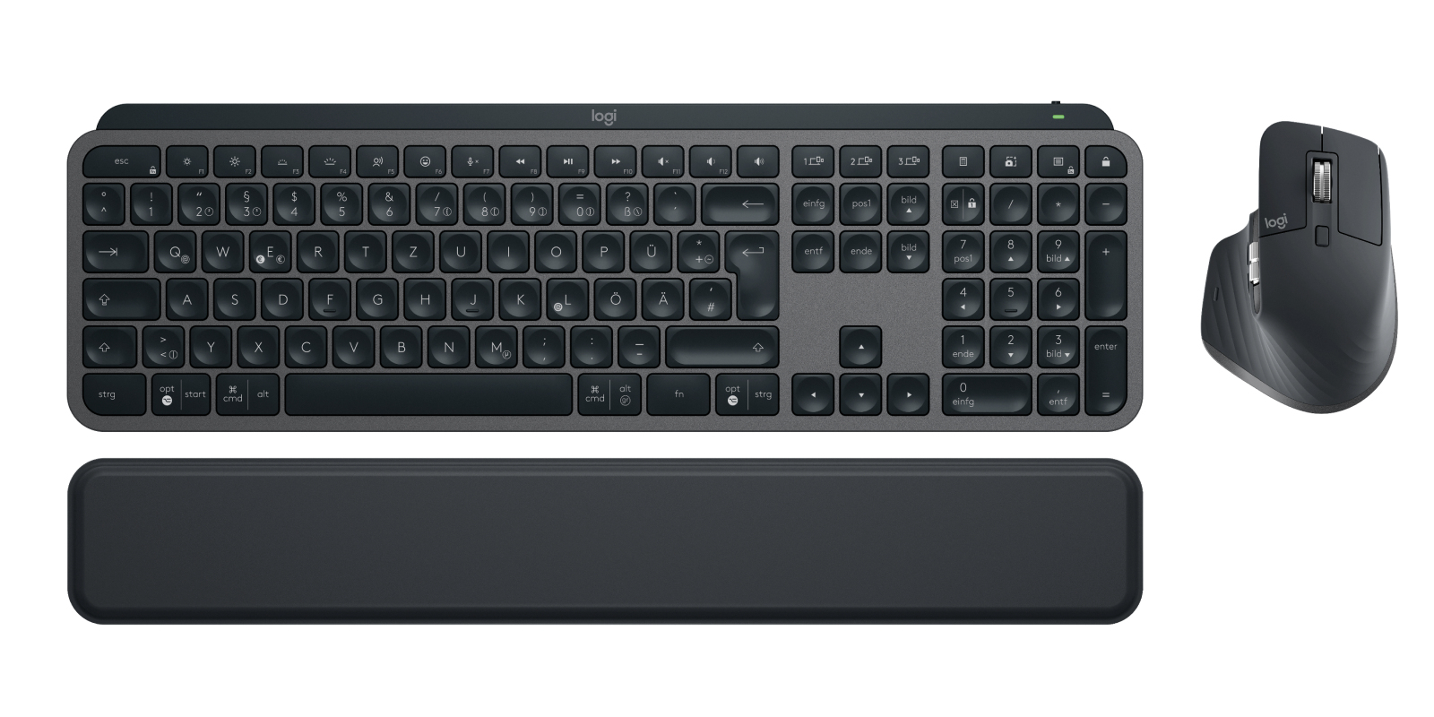 Logitech 920-010926. Keyboard form factor: Full-size (100%). Keyboard style: Straight. Connectivity technology: Wireless, Device interface: RF Wireless + Bluetooth, Keyboard key switch: Scissor key switch, Keyboard layout: QWERTZ, Keyboard number of keys: 108. Backlight type: LED, Wrist rest. Cable length: 1.3 m. Recommended usage: Office. Product colour: Graphite. Mouse included