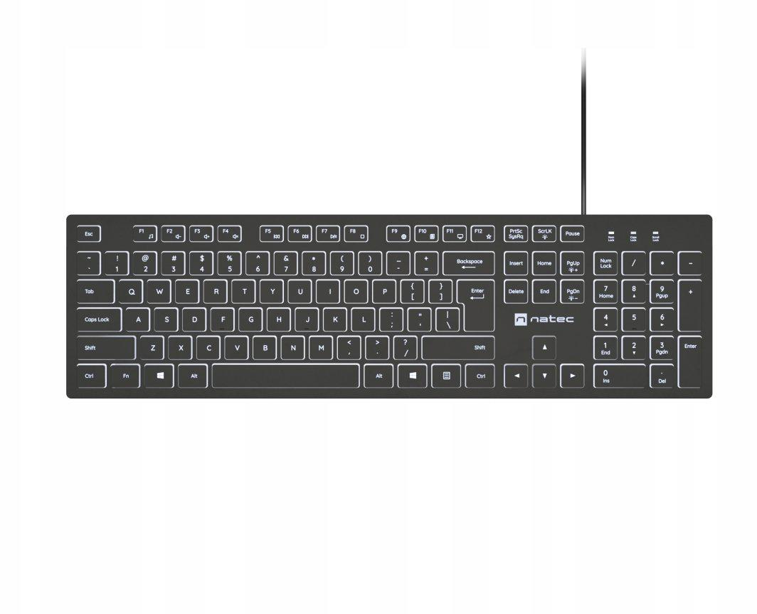 Tastatura Natec cu fir Herring Slim, membrana, iluminare alb taste, lungime cablu 150cm, 105 taste, layout ANSI-ISO, negru