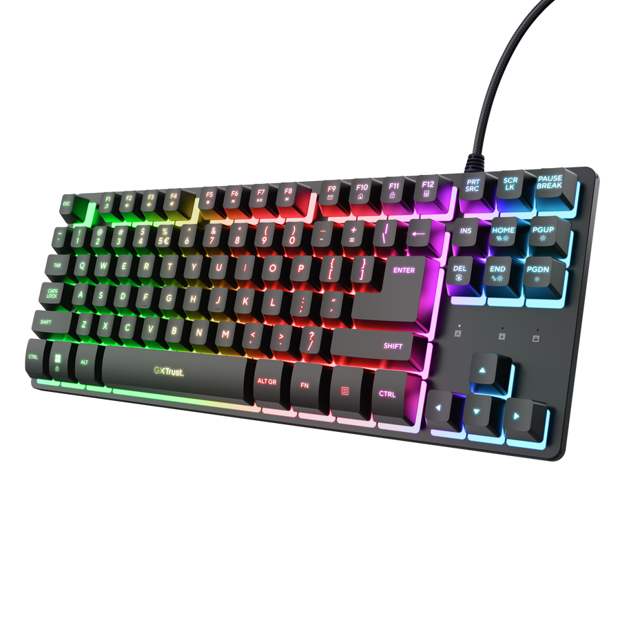 Trust GXT 833 Thado TKL. Keyboard form factor: Tenkeyless (80 - 87%), Connectivity technology: Wired, Device interface: USB, Keyboard key switch: Membrane, Keyboard layout: QWERTY, Keyboard number of keys: 87. Backlight type: RGB LED. Cable length: 1.5 m. Recommended usage: Gaming. Product colour: Black