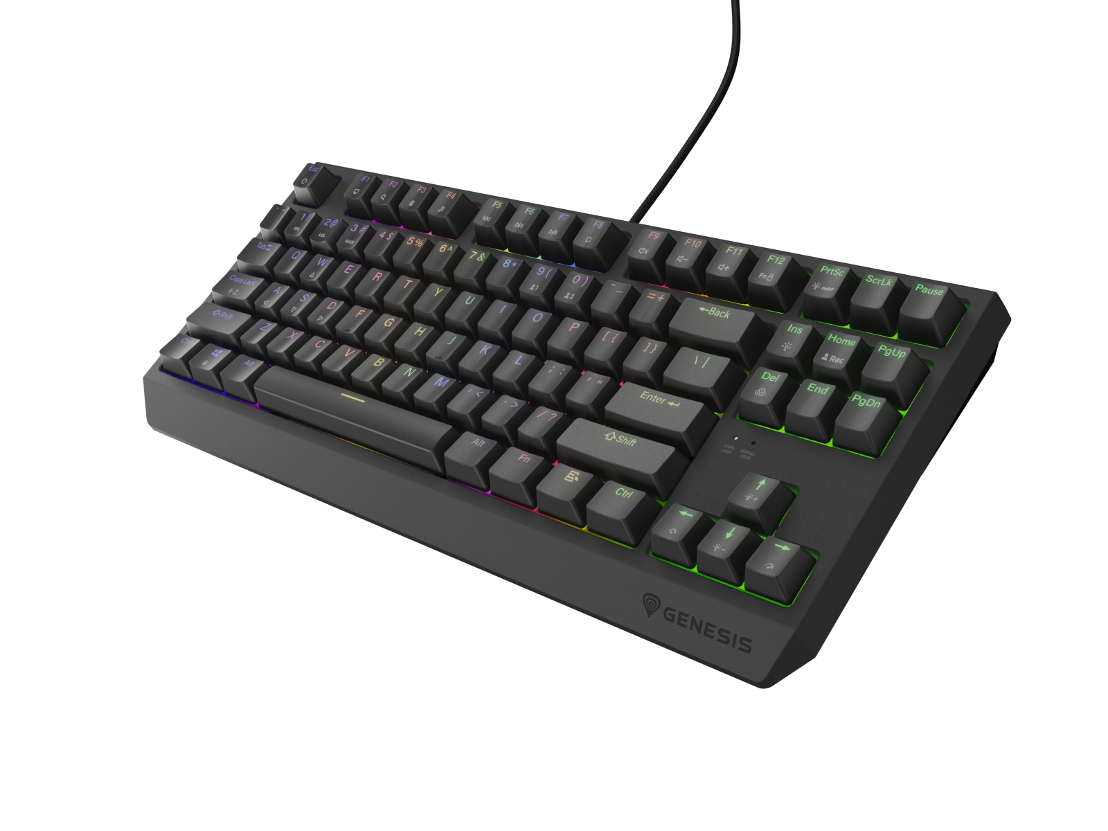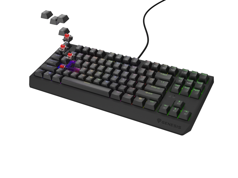 GENESIS Thor 230 TKL. Keyboard form factor: Tenkeyless (80 - 87%). Keyboard style: Straight. Connectivity technology: Wired & Wireless, Device interface: USB + RF Wireless + Bluetooth, Keyboard key switch: Mechanical, Keyboard layout: QWERTY, Keyboard number of keys: 87. Backlight type: RGB LED. Cable length: 1.6 m. Recommended usage: Gaming. Product colour: Black