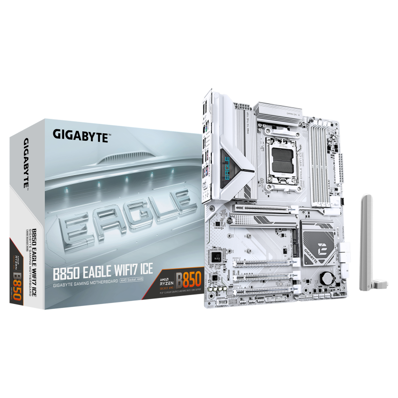 GIGABYTE B850 EAGLE WIFI7 ICE Motherboard - AMD Ryzen 9000 Series CPUs, 8+2+2 Phases Digital VRM, up to 8200MHz DDR5 (OC), 1xPCIe 5.0 + 2xPCIe 4.0 M.2, WIFI 7, 2.5 GbE LAN, USB 3.2 Gen 2. Processor manufacturer: AMD, Processor socket: Socket AM5, Compatible processor series: AMD Ryzen 7000 Series, AMD Ryzen 8000 Series, AMD Ryzen 9000 Series. Supported memory types: DDR5-SDRAM, Maximum internal memory: 256 GB, Memory slots type: DIMM. Supported storage drive interfaces: M.2, PCI Express 4.0, PCI Express 5.0, SATA III, Supported storage drive types: HDD & SSD, RAID levels: 0, 1, 10. Maximum resolution: 4096 x 2160 pixels. Ethernet interface type: 2.5 Gigabit Ethernet, LAN controller: Realtek RTL8125, Top Wi-Fi standard: Wi-Fi 7 (802.11be)