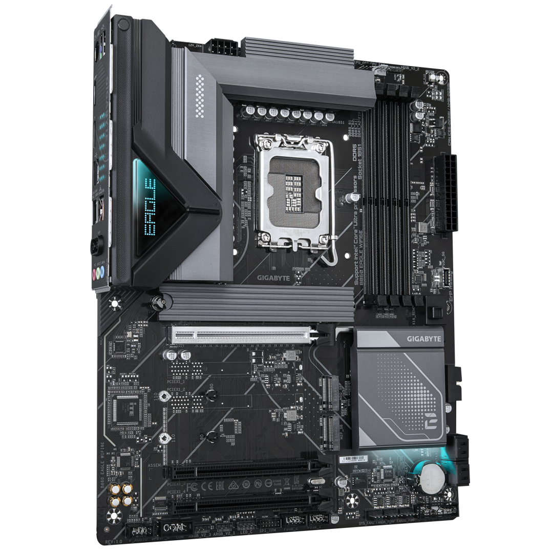 GIGABYTE B860 EAGLE WIFI6E Motherboard - Intel Core Ultra Series CPUs, 12+1+2+1 Phases VRM, up to 9066MHz DDR5, 1xPCIe 5.0 + 2xPCIe 4.0 M.2, 2.5GbE LAN, WIFI 6E, USB 3.2 Gen 2x2. Processor manufacturer: Intel, Processor socket: LGA 1851 (Socket V1), Compatible processor series: Intel® Core™ Ultra (Series 1), Intel Core Ultra (Series 2). Supported memory types: DDR5-SDRAM, Maximum internal memory: 256 GB, Memory slots type: DIMM. Supported storage drive interfaces: M.2, SATA III, Supported storage drive types: HDD & SSD, RAID levels: 0, 1, 5, 10. Maximum resolution: 4096 x 2160 pixels. Ethernet interface type: 2.5 Gigabit Ethernet, LAN controller: Realtek RTL8125D, Top Wi-Fi standard: Wi-Fi 6E (802.11ax)